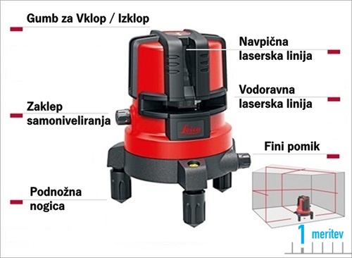 3 navpične in 1 vodoravna laserska linija Laserska točka na stropu in na tleh Ostre in dolge laserske črte